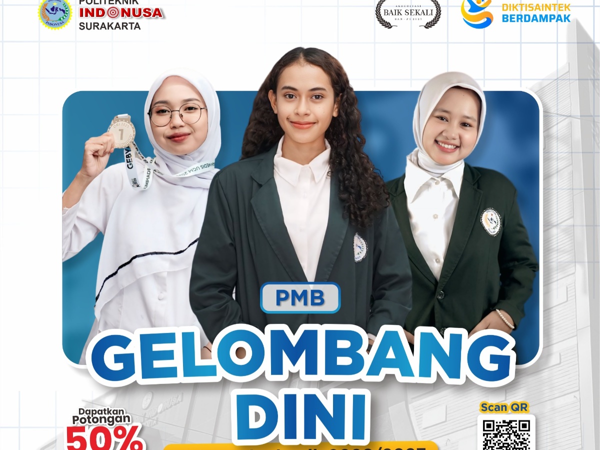 Politeknik Indonusa Surakarta, kembali menawarkan kesempatan emas bagi lulusan SMA/SMK/MA sederajat untuk bergabung dan menempuh pendidikan berbasis praktik industri dengan prospek kerja yang luas.