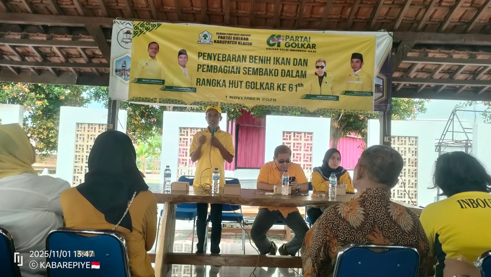 KLATEN, POSKITA.co – Meskipun langit terlihat mendung, tak menyurutkan niat pengurus DPD Partai Golkar Klaten mengadakan pembagian paket sembako dan tebar 85 benih ikan nila di Dukuh Ponggok, Desa Nganjat, Kecamatan Polanharjo, Klaten, Sabtu (1/11/2025) siang. Ratusan warga Nganjat hadir dalam acara yang dikemas di Joglo Nganjat dengan nuansa baju kuning.