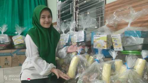 Galih Dayinta, staf BAZNAS Klaten tunjukkan bahan dan alat memasak yang diberikan dari hasil infak dan sedekah BAZNAS Klaten 2025.