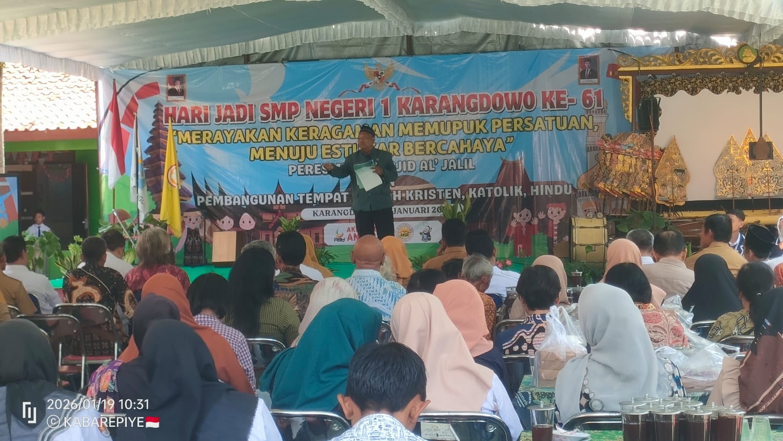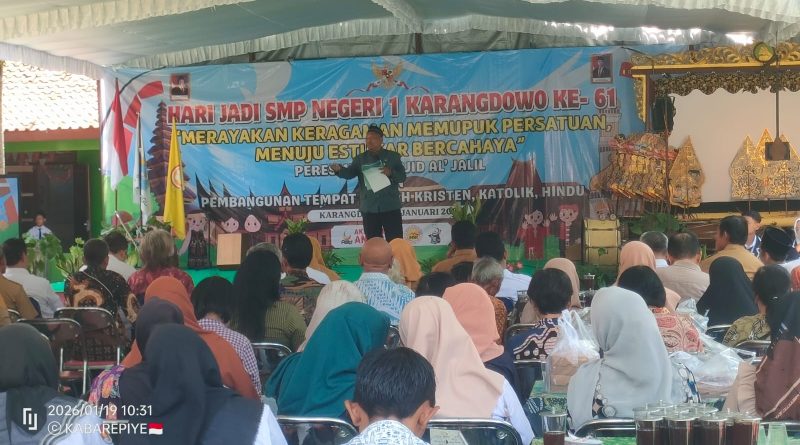 NB Foto Atas: Kepala SMPN 1 Karangdowo H. Sugeng Sihono, SPd MPd sedang memberikan kata sambutan terkait agenda HUT ke-61 dan sejumlah informasi penting lainnya, termasuk agenda peresmian masjid, peletakan batu pertama gereja dan pura, Senin (19/1/2026).