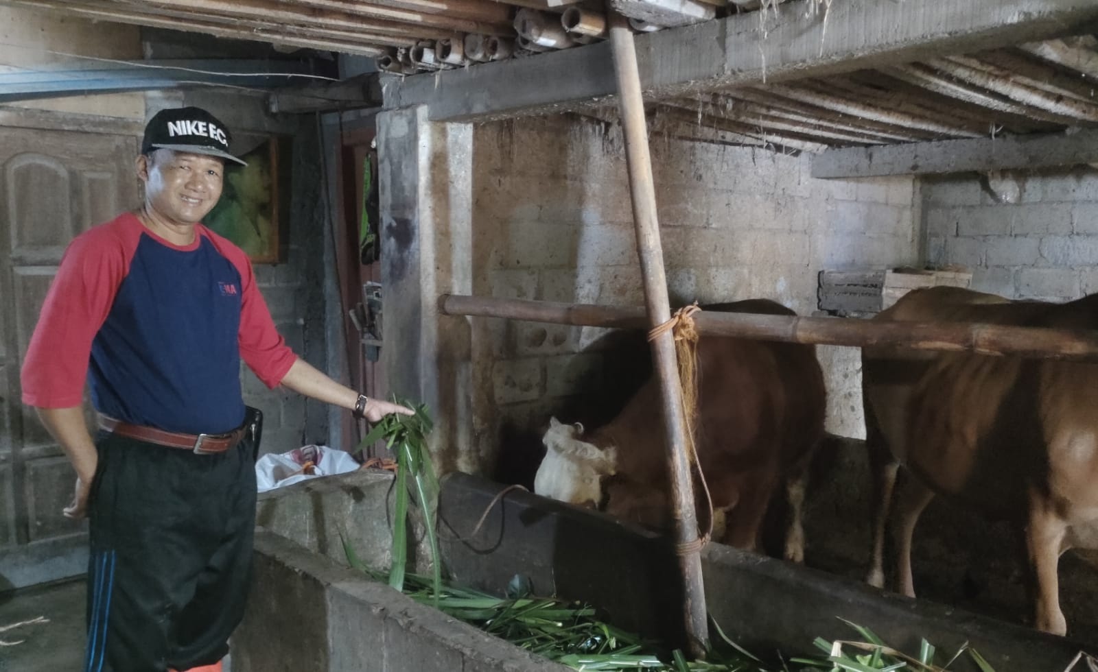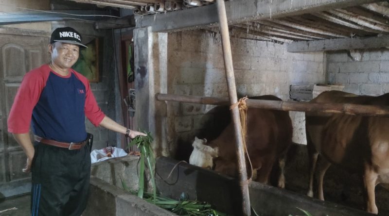 Foto Atas: Tampak H. Jumarno, SSos sedang menunjukkan dua ekor sapinya yang setiap hari dibersihkan kotorannya dan dijadikan bahan bakar biogas, Minggu (22/2/2026) pagi.
