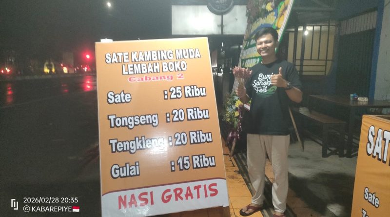 KLATEN, POSKITA.co – Ramadhan 2026 ini tetap menjadi berkah. Salah satunya Sarjono alias Mas Jon yang membuka warung sate cabang. Katanya untuk lebih mendekatkan pecinta kuliner, Mas Jon membuka warung kuliner Sate Kambing Lembah Boko Cabang 2 di timur bangjo Golkar Klaten atau 50 meter timurnya Kantor Kecamatan Klaten Selatan, Jumat (27/2/2026) petang.