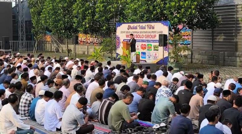 Usai melaksanakan ibadah sholat berjamaah, Owner Wong Solo Grup dan Kalipepe Land, Puspo Wardoyo berbagi uang fitrah dan bingkisan lebaran kepada ribuan jamaah yang hadir di area Destinasi Wisata Air Kalipepe Land.