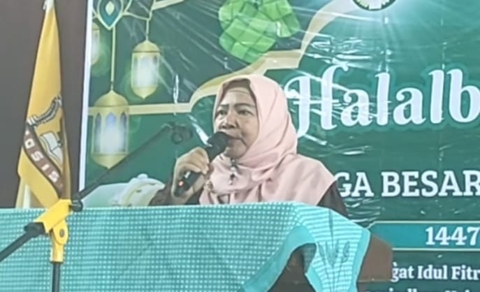 Keterangan Foto: Kepala SMPN 2 Trucuk, Klaten, Aniek Sugesti Handayani, SPd MPd memberikan kata sambutan di acara halal bihalal Estruda 2026 ini.