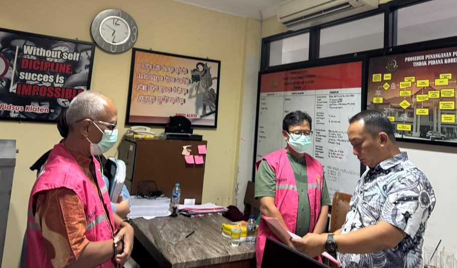 Petugas Kejari Klaten saat intensif memeriksa Kades Semangkak Ngadiyatno terkait penyimpangan anggaran rehab masjid Al Huda Semangkak di ruang Kejari Klaten, Jumat (17/4/2026).
